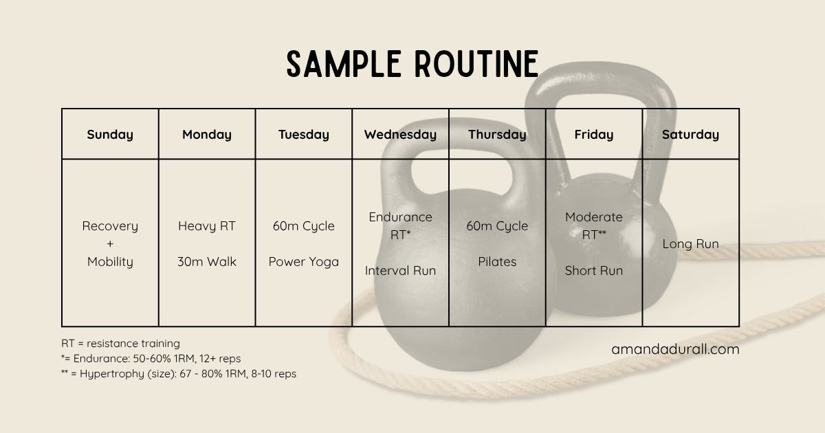 You can still complete all your regular programming as long as you allow enough recovery to meet the demands of each individual training session. Here’s an example: