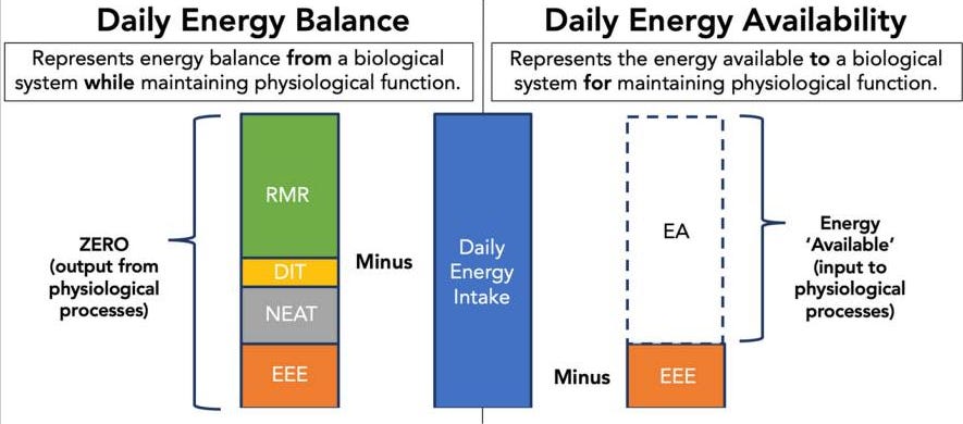 This image provides a visual of how energy balance and energy availability are defined. Energy balance accounts for all other forms of energy expenditure; energy availability focuses on the effects of exercise energy expenditure.
