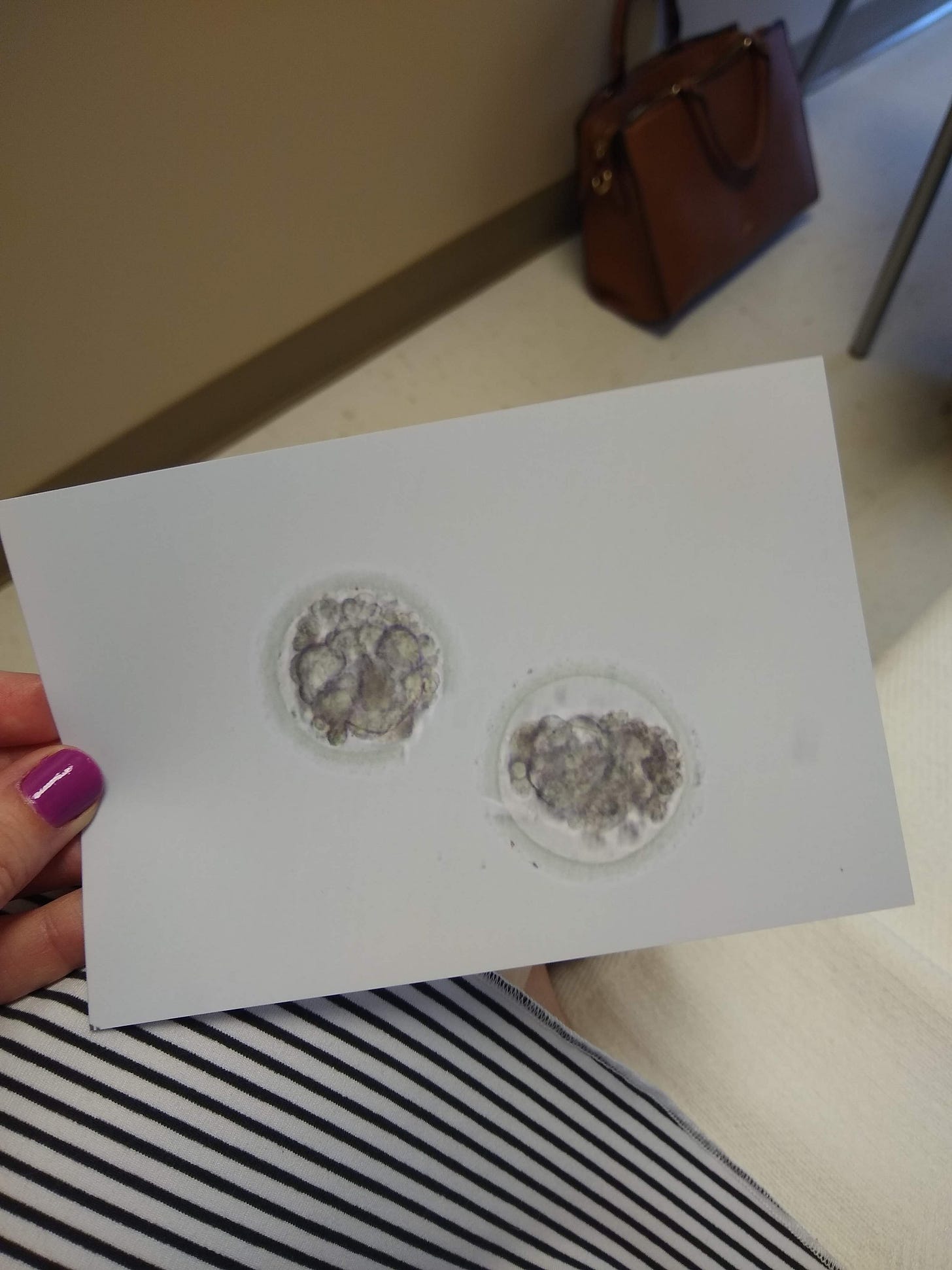 On the morning of the embryo transfer, they begin to thaw your frozen embryos. The two that were donated to us were frozen in the same "straw”, so the plan was to thaw, use one, and refreeze the other for later. Before the procedure, our doctor came out to tell us that one of the embryos wasn’t looking good and it would not survive another freeze cycle. Because I was healthy and because the chances were slim (<10%) that it would implant, she said she would transfer them both.